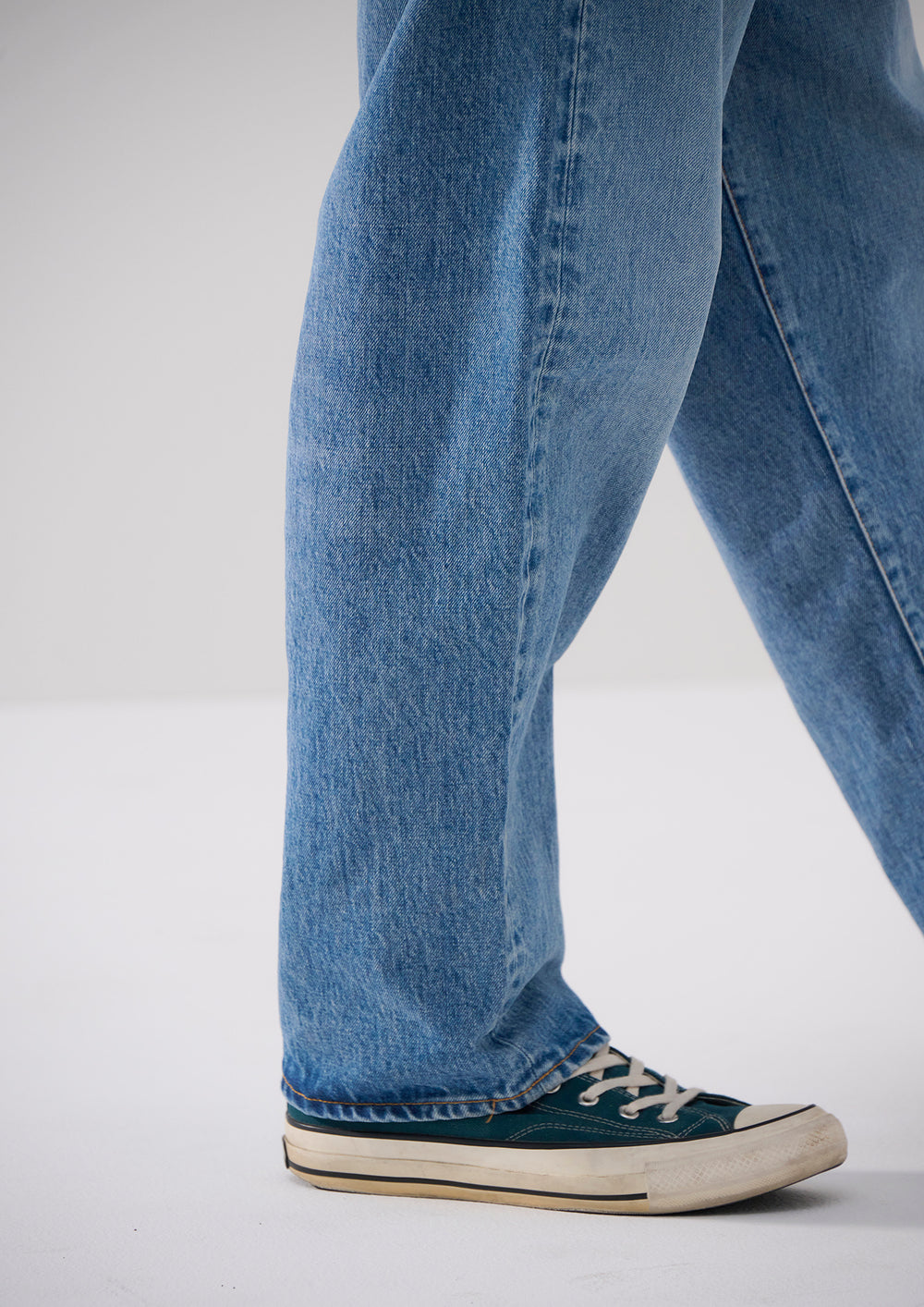 13.5ozムラ糸コットンデニムを使用した1995バギートラウザーズにストーンバイオ加工を施し、年季の入った風合いに仕上げたハードウォッシュ仕様。ゆったりとテーパードしたバギー型のシルエット、コインポケット付きのLポケ及びパッチポケットを前後に、腰帯の内側に「1995 | Wide」のプリント。背面にはペーパーパッチ付き。