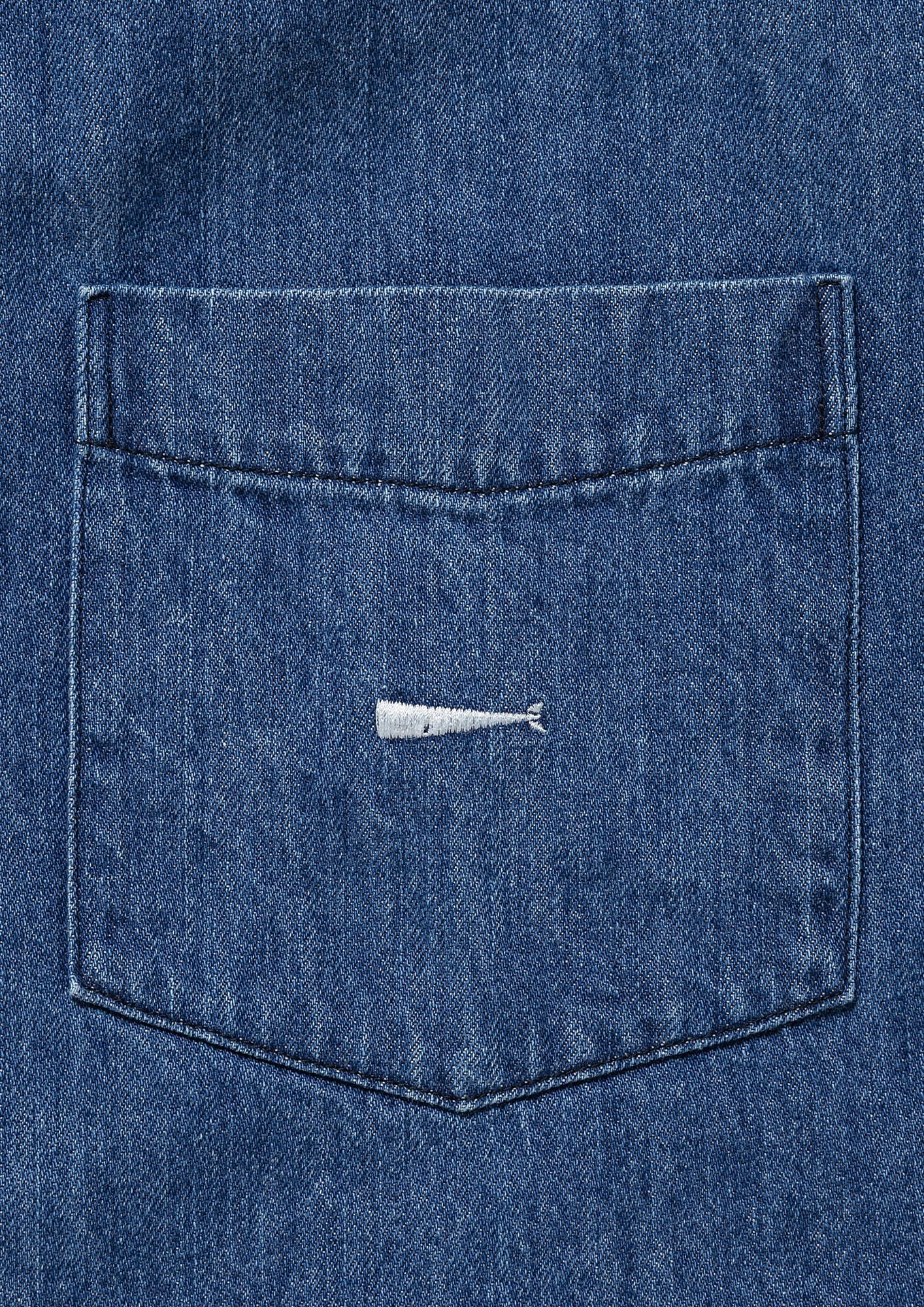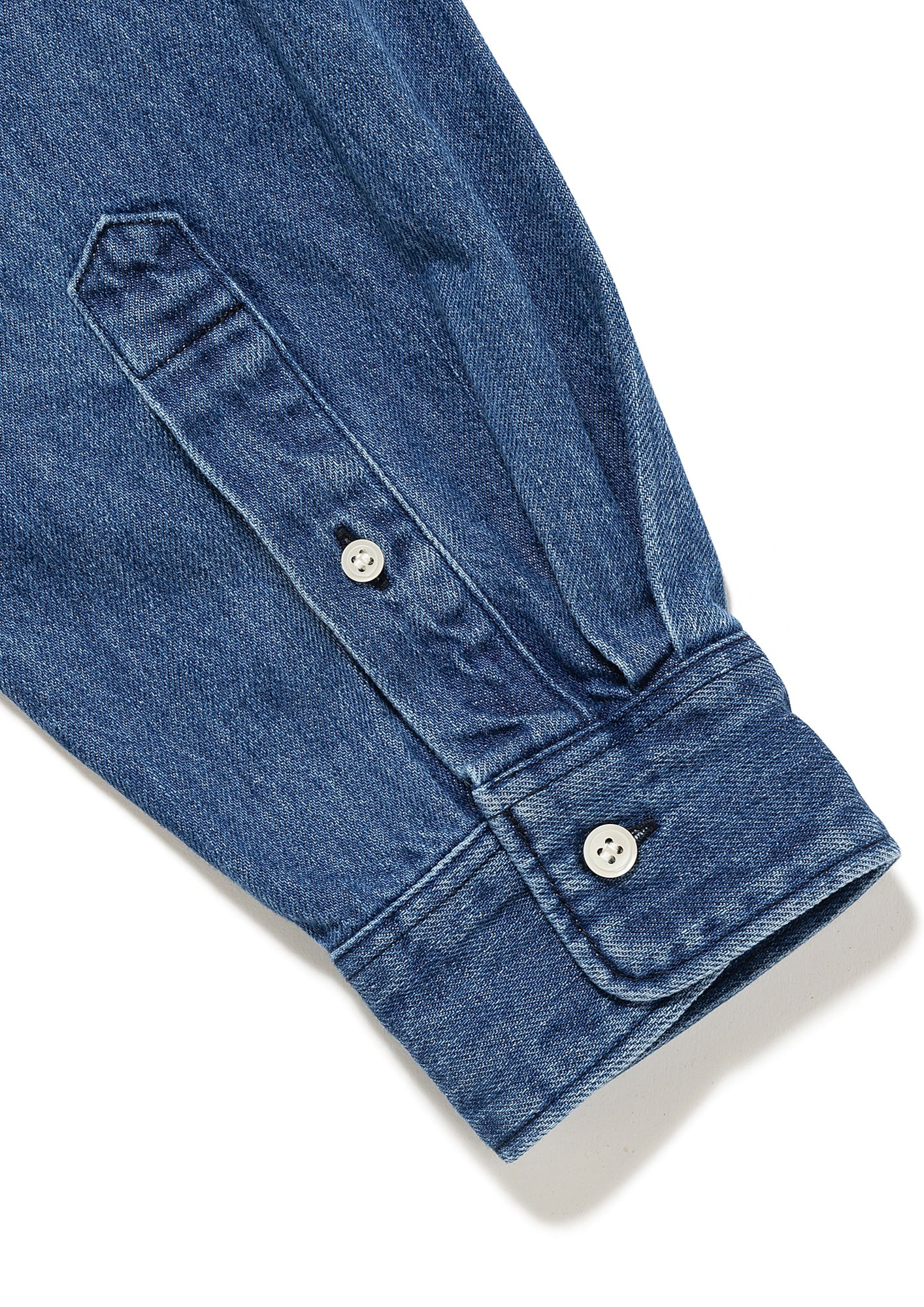 9ozソフトデニムを使用し、ウォッシュ加工を施したボタンダウンシャツ。ゆったりとした身幅のシルエット、ループ付きセンターボックスプリーツ、ガントレットボタン仕様。バストポケットにはCACHALOTの刺繍ロゴ入り。